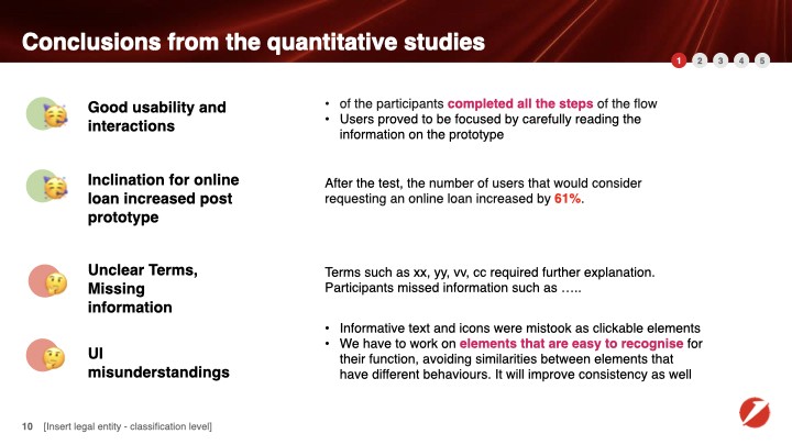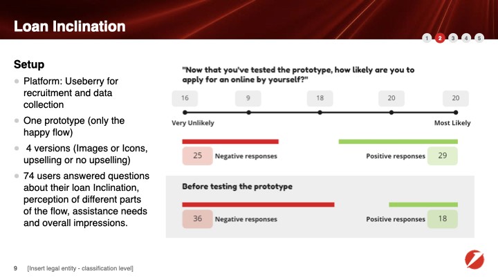 To uncover usability gaps in the complex mobile loan application process, we conducted qualitative interviews (via an external agency) and quantitative testing with Useberry. We did A/B testing with different visuals (illustrations vs. photography) and slightly different flows. We measures task completion rate and time, gathered insights from heatmaps and collected feedback on overall impression, terminology comprehension, CTA visibility and perception, trust and support needs of the users. We supplemented our research with benchmarking against major Austrian competitors.